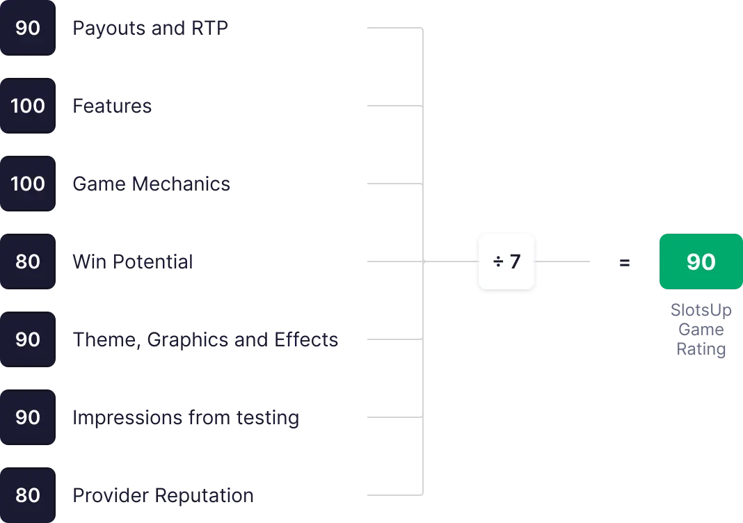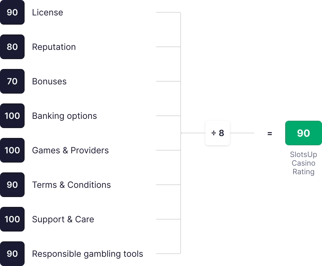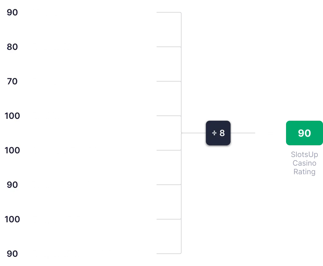 Оценката на казиното от SlotsUp се изчислява въз основа на 8 ключови метрики, всяка с резултат от 0 до 100. Тези резултати се събират, осредняват и използват за определяне на крайната обща оценка.