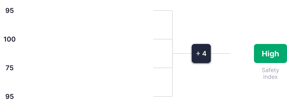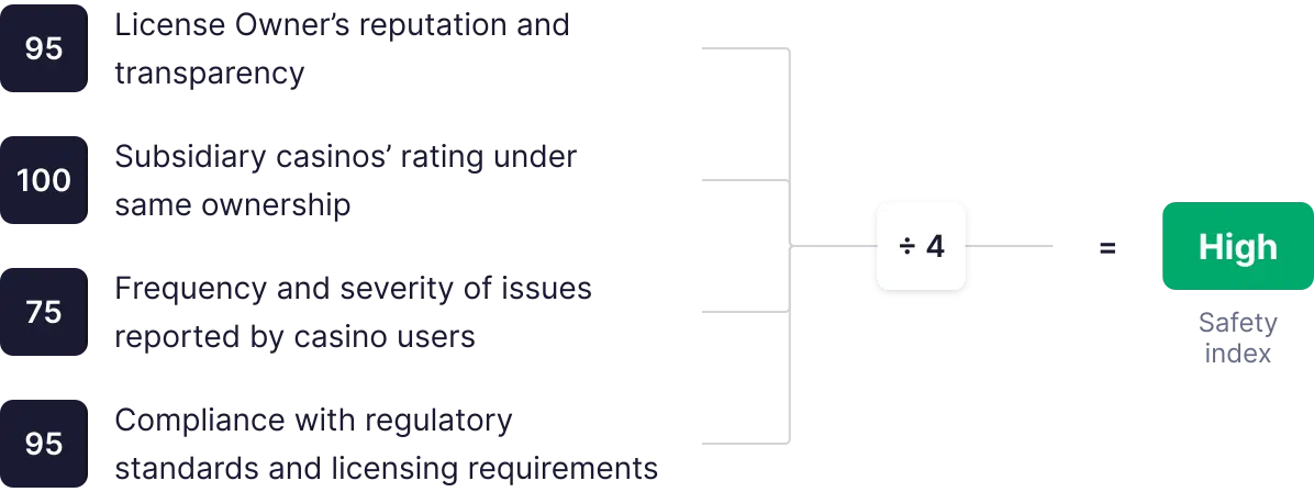 Оценяваме безопасността на казиното въз основа на 4 критерия (2 индивидуални и 2 взаимосвързани), всеки оценен от 0 до 100. Оценките се сумират, осредняват и използват за определяне на крайния индекс за безопасност.